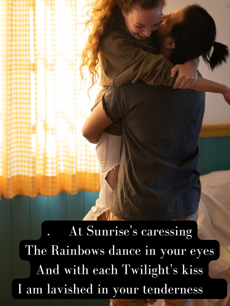At Sunrise's caressing, the rainbows dance in your eyes And with each Twilight's kiss, I am lavished in your tenderness... Poetic moments #love #poetry #minds