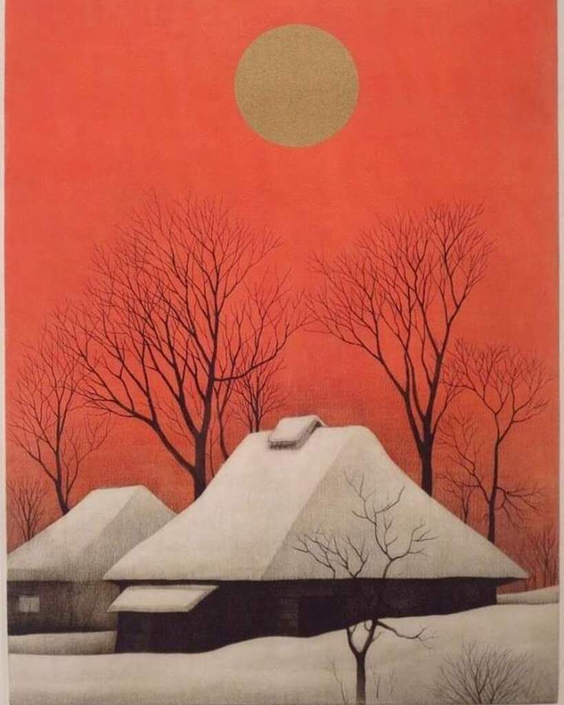 Koichi Sakamoto 坂本好一, (b. 1932) - Houses with Red Sky.