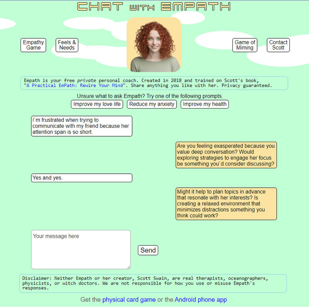 No sign-up or sign-in needed to talk with her: https://empathybot.net