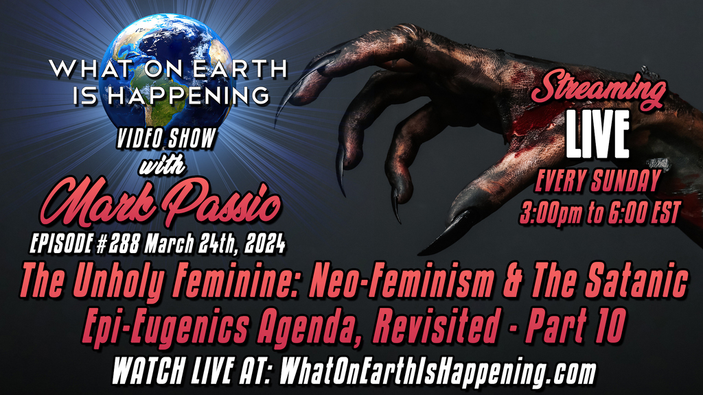 What On Earth Is Happening Episode #288 streams live today, March 24, 2024 at 3:00 pm Eastern US time. Topic: The Unholy Feminine: Neo-Feminism & The Satanic Epi-Eugenics Agenda, Revisited - Part 10. Simulcasting on WOEIH, OGWN, Telegram, Twitch, YouTube, Facebook, Twitter, Rumble, Odysee, and DLive. Watch live at: https://www.whatonearthishappening.com/show