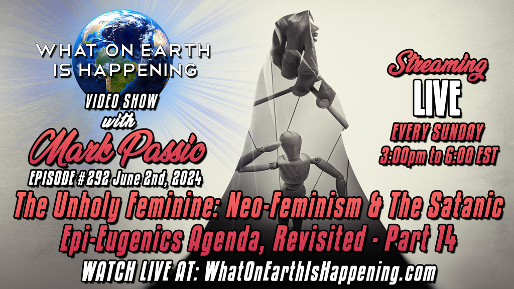 What On Earth Is Happening Episode #292 streams live today, June 2, 2024 at 3:00 pm Eastern US time. Topic: The Unholy Feminine: Neo-Feminism & The Satanic Epi-Eugenics Agenda, Revisited - Part 14. Simulcasting on WOEIH, OGWN, Telegram, Twitch, YouTube, Facebook, Twitter, Rumble, Odysee, and DLive. Watch live at: https://www.whatonearthishappening.com/show