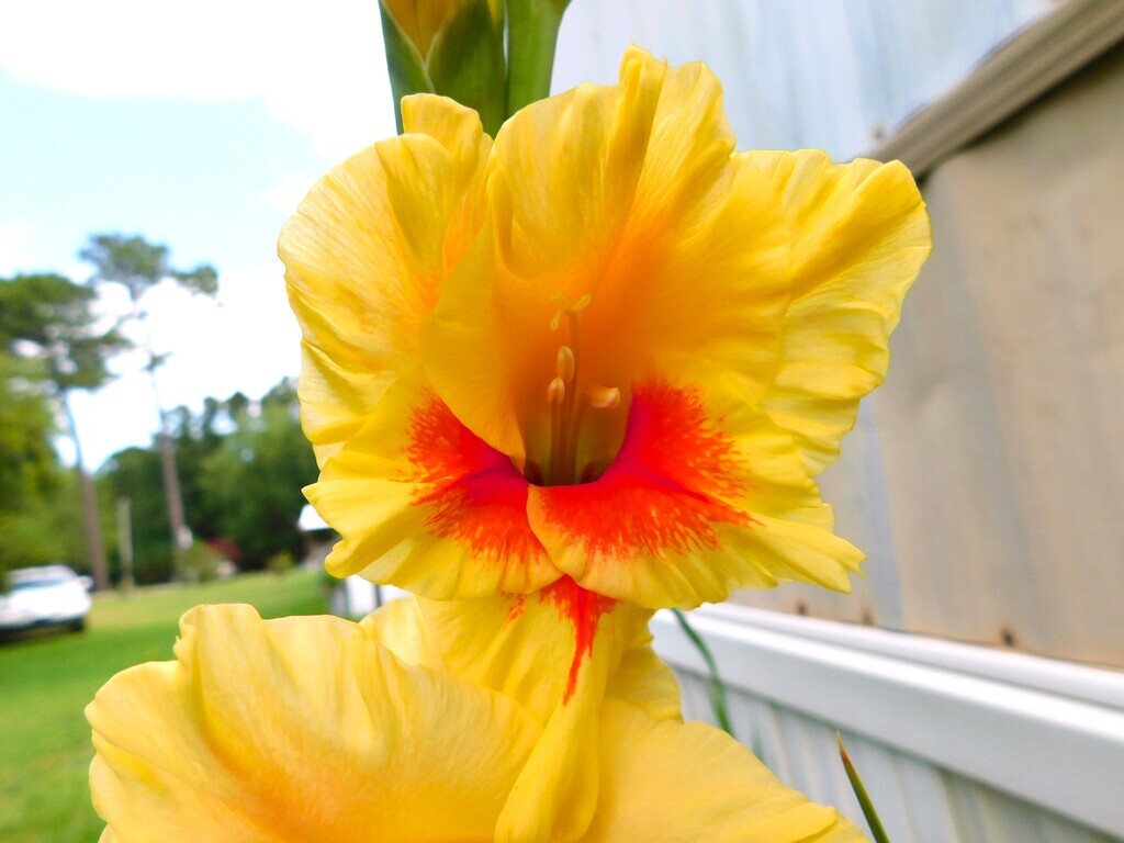 OOOOO My Favorite Color Scheme of Gladds is blooming! Second favorite are the pink and yellow ones . See the slight purple in the middle that spreads out to almost the tips of the orange-red? LOVE IT