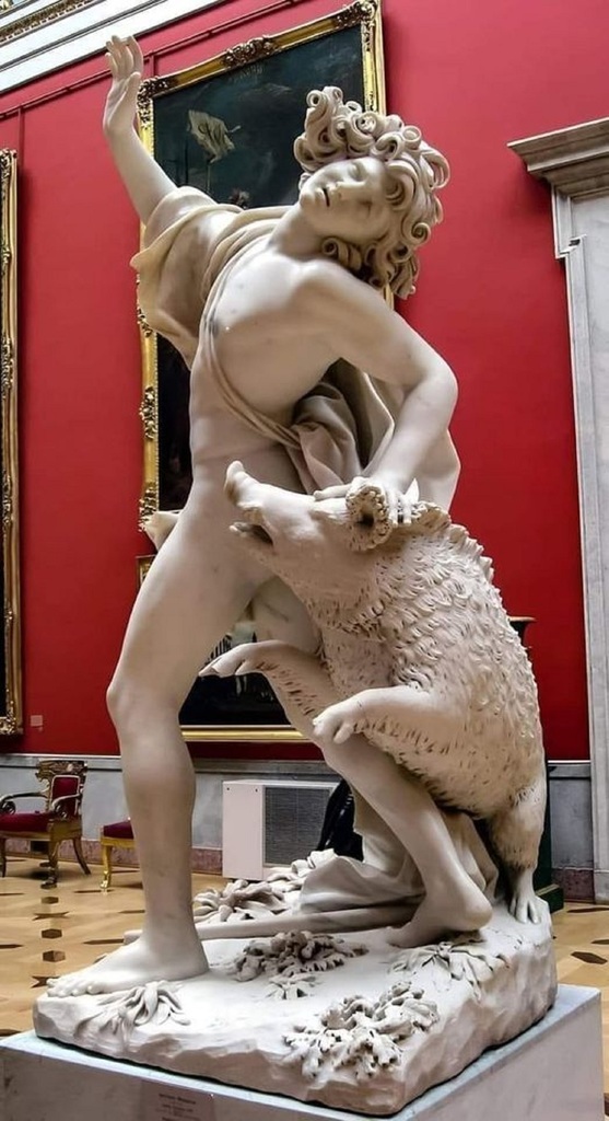 "The Death of Adonis," sculpted in marble between 1700 and 1710 by Giuseppe Mazzuoli, captures the tragic death of the young Adonis, loved by the goddess Venus, based on the "Metamorphosis" of Ovidio. This masterpiece of Baroque sculpture, highlighted for its realism and emotionality, is currently on display at the Hermitage Museum in St. Petersburg, where it continues to impress visitors with its detailed depiction of a story of love and loss.