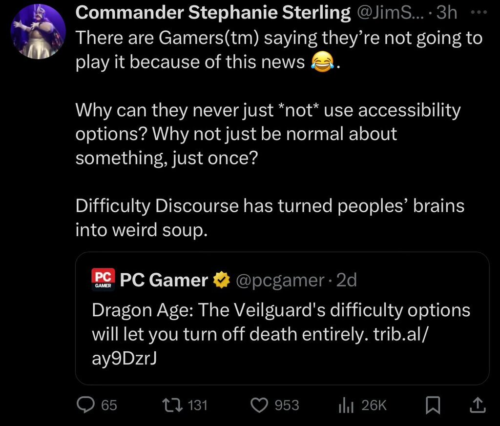 MUH ACCESSIBILITY Says the fat weirdo that thinks he's a woman because gender ideology. The Dylan Mulvaney of gaming.