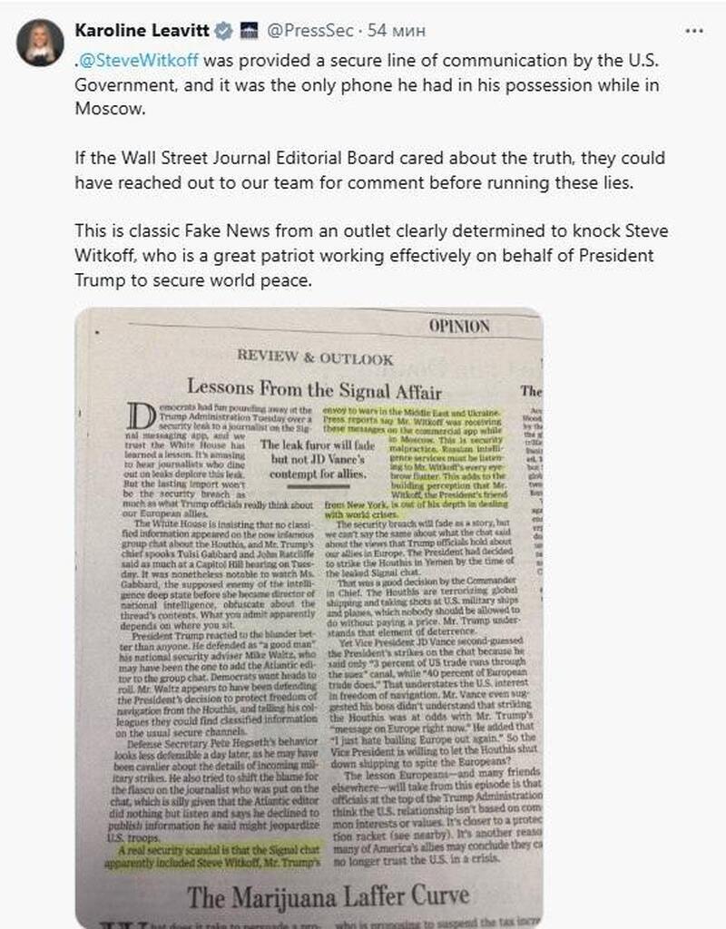 White House Press Secretary Leavitt said that during his visit to Moscow, Witkoff used a special phone to communicate with Washington and was not a member of the scandalous Signal chat.