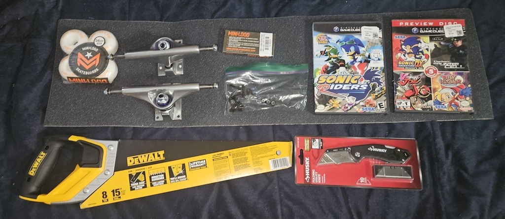 Game Hunting Finds Griptape 4 Wheels 2 Trucks Bearings Bag of Nuts and Screws Sonic Rider (GameCube) Preview Disc (GameCube) Saw Box Cutter