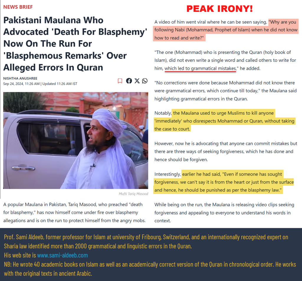 A Pakistani cleric who called for the indiscriminate murder of anyone suspected of blasphemy commits blasphemy by pointing out grammatical errors in the Quran and questioning why Muslims believe in this illiterate Mohammed.