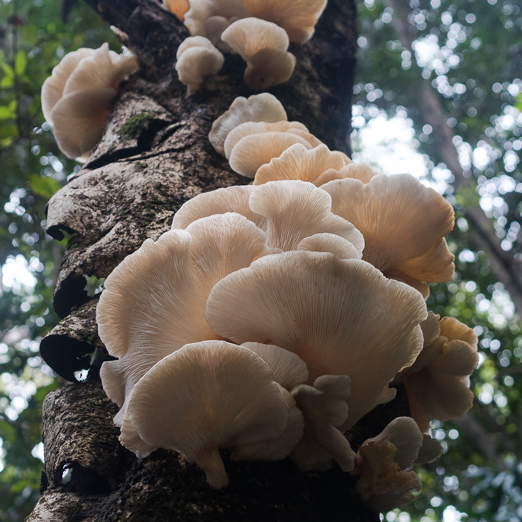 I'd seen similar mushrooms growing at the base of the dead host, about a week ago: And then yesterday as I was looking at the gnarly peeling away bark, something made me look up.
