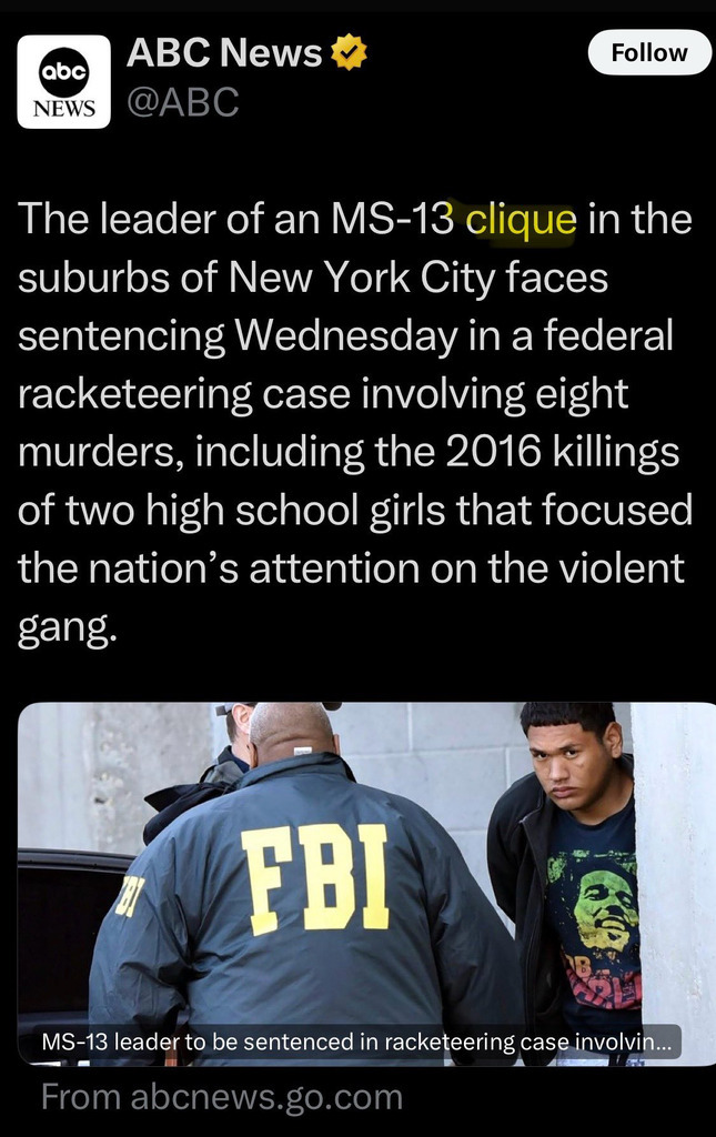 The Marxist retards in the US now use the term "clique" instead of gang to designate members of MS-13. WTF is wrong with them?