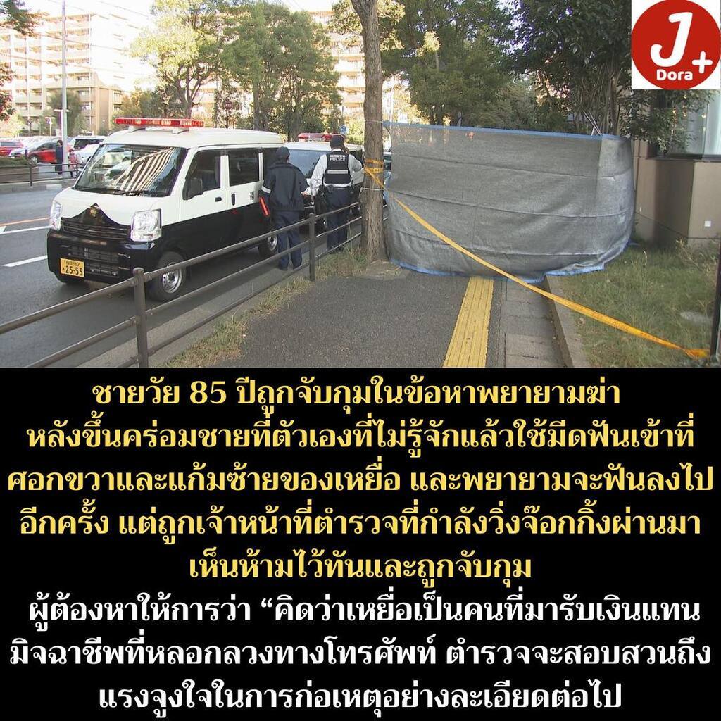 ชายวัย 85 ปีถูกจับกุมในข้อหาพยายามฆ่า หลังขึ้นคร่อมชายที่ตัวเองที่ไม่รู้จักแล้วใช้มีดฟันเข้าที่ศอกขวาและแก้มซ้ายของเหยื่อ และพยายามจะฟันลงไปอีกครั้ง แต่ถูกเจ้าหน้าที่ตำรวจที่กำลังวิ่งจ๊อกกิ้งผ่านมาเห็นห้ามไว้ทันและถูกจับกุม ผู้ต้องหาให้การว่า...See more