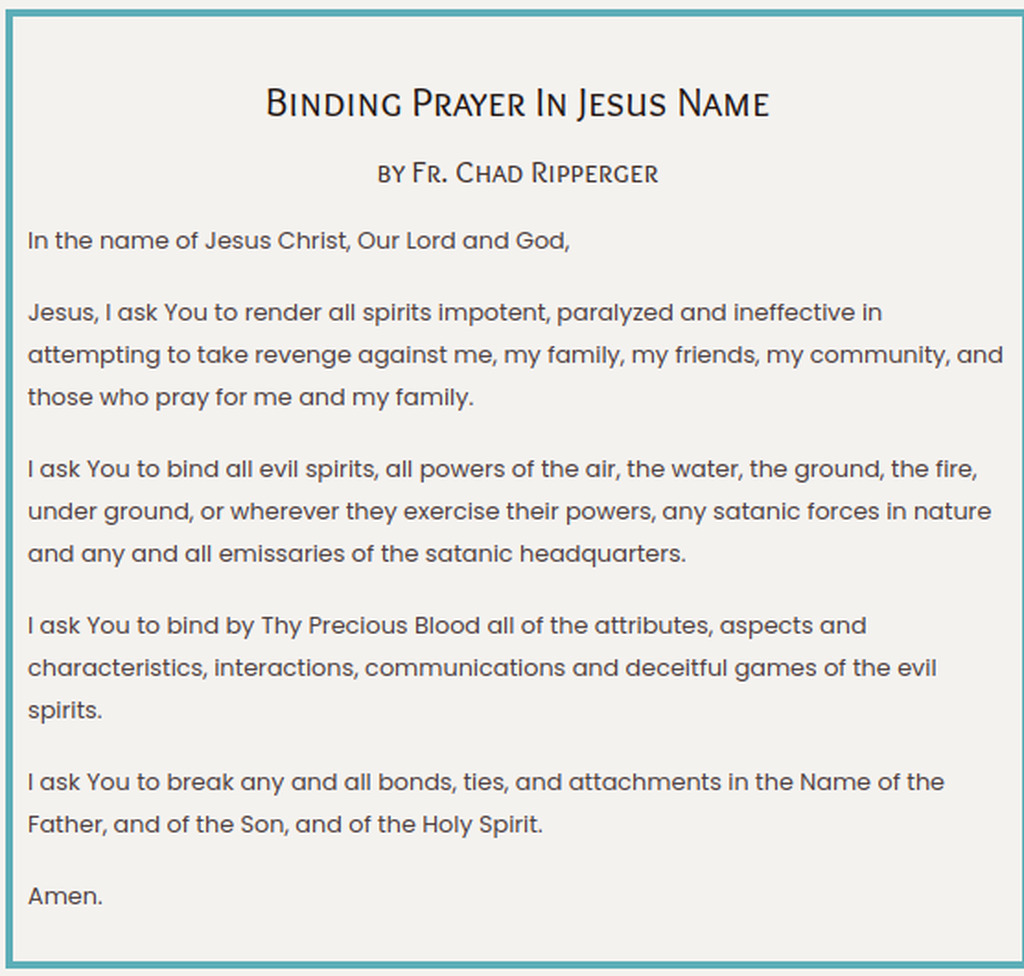 Father's interview w/Shawn https://www.youtube.com/watch?v=I2p_cfipbEw . https://iamjesus.net/binding-prayer-in-jesus-name-against-evil-spirits/ . https://www.tumblarhouse.com/products/deliverance-prayers-fr-ripperger-book . Prayer to Bind & Blind Demons https://mycatholic.life/catholic-prayers/prayer-to-bind-blind-demons/ . Understanding Binding Prayers https://www.conquerthedevil.com/understanding-binding-prayers/