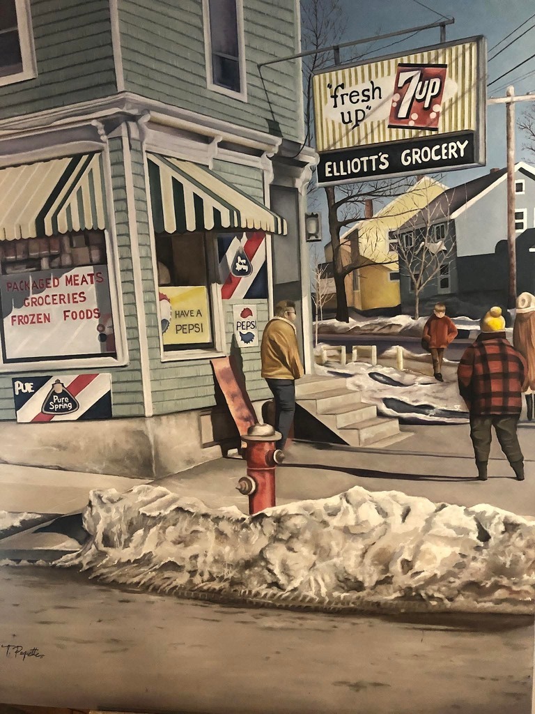 Painting by Teri Paquette: Elliotts Grocery Oil on Canvas 48” x 60” Dartmouth, Nova Scotia From a photo by Bruce Carmichael 1967