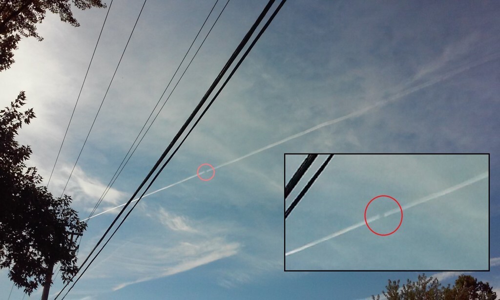 IMPORTANT PROOF CHEMTRAILS ARE NOT NATURAL (1 of 3): This is the first of three pictures I took in quick succession of this event. I was walking along and watching as one chemtrail plane was going through the sky with its 'trail' of poison intact. Then I watched and was so amazed by what I saw, I stopped walking, and watched as the plane's trail stopped for a very short moment but then --- it started/continued again!!! This is not natural! If it was wind, it would have been a larger gap. I riffled in my bag for my phone to capture this. When I took this and two other pictures, the plane had continued on with its trail, but as you can see here it left a small gap in it's sky-path from when it (for some reason) stopped and restarted the purposeful poison-trail in the sky. I witnessed this while walking home and taking pictures of many other parallel ongoing chemtrails above my town. Maybe the pilot saw me taking pictures of the other chemtrails in the sky and wanted to send me a message. I think this is very important and proves that these trails in the sky are not naturally occurring from planes interaction with the sky and surrounding clouds, but a purposeful dump of (who knows exactly what) toxins in the sky by these pilots not on commercial flights but intentional missions to do this. (the only editing I have done here it to show the zoom-in and circle the gaps, and I will post the other two pictures right after this)