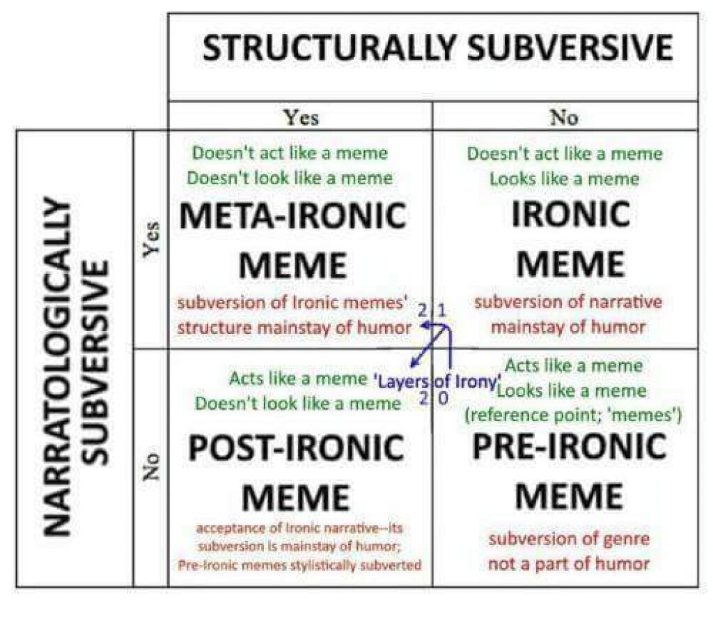 A basic primer on memetic layers of irony: (see comments for examples of each)