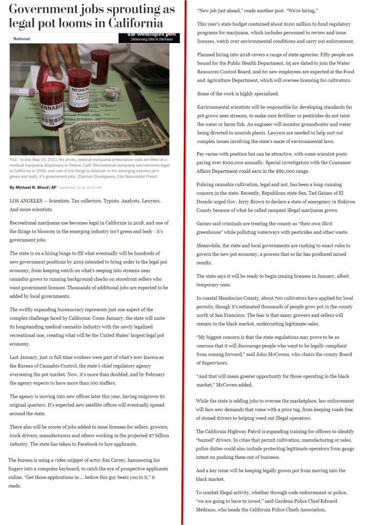 ...งจากกัญชาเป็นผลิตภัณฑ์ที่ถูกกฎหมายไปแล้ว (อ้างอิง: Government jobs sprouting as legal pot looms in California - https://www.washingtonpost.com/national/government-jobs-sprouting-as-legal-pot-looms-in-california/2017/09/30/8be9bf08-a5ed-11e7-b573-8ec86cdfe1ed_story.html) ---------------------------------- นครลอส แองเจิลลีส: ตำแหน่งหน้าที่การงานมีอาชีพการเป็น นักวิทยาศาสตร์, ผู้ทำการเก็บภาษีอากร, พนักงานป้อนพิมพ์ข้อมูลเข้าสู่ระบบ, ผู้ชำนาญการวิเคราะห์, นักกฎหมาย และนักวิทยาศาสตร์อีกหลายสาขา การใช้กัญชาเพื่อการสันทนาการ (Recreational marijuana) จะกลายเป็นเรื่องถูกต้องตามกฎหมายเมื่อเริ่มต้นปี พ.ศ. 2561 และเรื่องหนึ่งที่เริ่มงอกเงยในอุตสาหกรรมที่เพิ่งผุดขึ้นมานี้ ไม่ใช่เกี่ยวกับเรื่องดอกไม้ใบหญ้าสีเขียวแต่อย่างใด – แต่มันกลายเป็น ตำแหน่งการงานภายในรัฐบาลต่างหาก ในเวลานี้ ทางรัฐบาลของรัฐแคลิฟอร์เนียกำลังอยู่ในช่วงระยะของการประกาศว่าจ้างบุคลากร เพื่อเข้าไปประจำตำแหน่ง และท้ายที่สุดแล้ว ก็จะมีตำแหน่งใหม่ๆ เพิ่มขึ้นในรัฐบาลนับหลายร้อยตำแหน่ง ภายในปี พ.ศ. 2562 และจุดประสงค์ก็เพื่อ นำเอาเรื่องของความถูกต้องตามกฎหมายในการเสพกัญชามาปฏิบัติใช้ต่อการช่วยเหลือเรื่องทางเศรษฐกิจ หลังจากที่ทำการเฝ้ามองสังเกตการณ์ว่า อะไรจะแทรกซึมเข้ามาสู่กระแสของการเจริญเติบโตเกี่ยวกับเรื่องเกี่ยวกับกัญชา ด้วยการตรวจสอบเช็คประวัติพื้นเพเบื้องหลังชองผู้ประกอบการขายผลผลิตต่างๆ ซึ่งต้องการใบอนุญาตการค้าขายจากรัฐบาล และมีการคาดหวังกันว่า จะมีตำแหน่งงานเพิ่มขึ้นเป็นจำนวนนับพันตำแหน่ง ที่จะเข้าไปเพิ่มสู่ส่วนงานในรัฐบาลส่วนท้องถิ่นต่างๆ อีกด้วย การขยายตัวของระบบทางการอย่างรวดเร็ว เป็นตัวแทนให้เห็นเพียงมุมมองเดียวในเรื่องของการท้าทายอันยุ่งยากสลับซับซ้อน ที่ทางรัฐแคลิฟอร์เนียต้องเผชิญหน้าอยู่: เมื่อเดือนมกราคมที่กำลังจะมาถึงนี้ ทางการของรัฐจะรวมอุตสาหกรรมที่เกี่ยวข้องกับการใช้กัญชาทางการแพทย์ (Medical Cannabis) ไปเข้ากับกลุ่มของการใช้กัญชาเพื่อการสันทนาการ ให้เข้ามาอยู่ด้วยกันเป็นหนึ่งเดียว เรื่องนี้ทำให้กลายเป็นฐานเศรษฐกิจที่ใหญ่ที่สุดของประเทศสหรัฐอเมริกา ในเรื่องของการค้าขายกัญชาอย่างถูกต้องตามกฎหมาย ---------------------------------- เมื่อเดือนมกราคมที่ผ่านมา มีพนักงานที่ทำงานเต็มเวลาทั้งหมดเพียงแค่ 11 คน ซึ่งเป็นส่วนหนึ่งที่ทราบกันในปัจจุบันว่า เป็นหน่วยงานของกองควบคุมกัญชา (Bureau of Cannabis Control) หัวหน้าผู้ออกระเบียบควบคุมองค์กรของรัฐ เป็นผู้กำกับดูแลตลาดการซื้อขายกัญชาทั้งหมด ในเวลานี้ จำนวนพนักงานได้เพิ่มขึ้นมากกว่าสองเท่าตัว และในเดือนกุมภาพันธ์ของปี พ.ศ. 2561 นี้ ทางองค์กรคาดหวังว่า จะมีพน