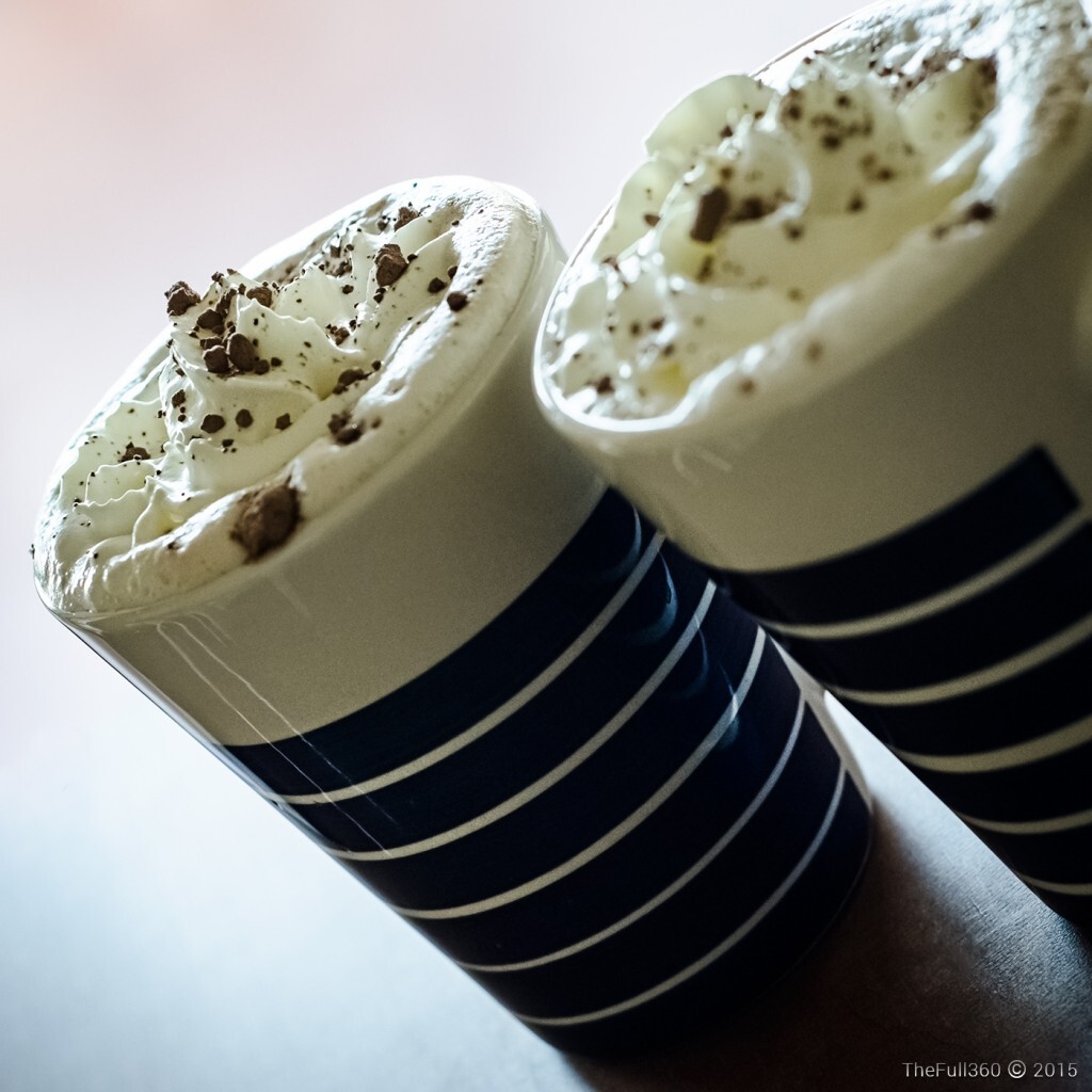 Two Latte's topped with whipped cream on the terrace in the morning sun.