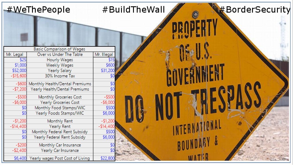 #WeThePeopleMemes #BuildTheWall #BorderSecurity The unbalanced saturation of illegal under the table workers is one of the many things that are sapping our once thriving American Economy. It's not hard to see why when you look at an example of a basic comparison of wages between over and under the table Undocumented Illegal Aliens saturation is immeasurable. They are NOT represented in biased polls which only factor in the "honest" aliens.