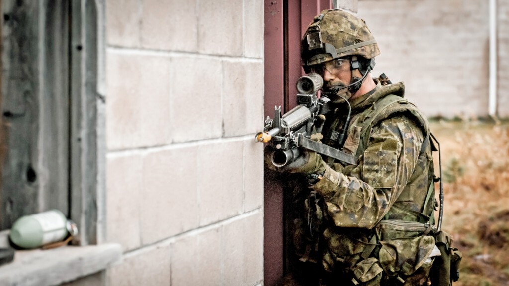 A Canadian Soldier watches for enemy movement in Austere Village, during the Development Period 3 Bravo Platoon Commander Course held at 5th Canadian Division Support Base Gagetown, on May 3, 2018. (Credit: Cpl. Morgan LeBlanc Infantry School, Gagetown)
