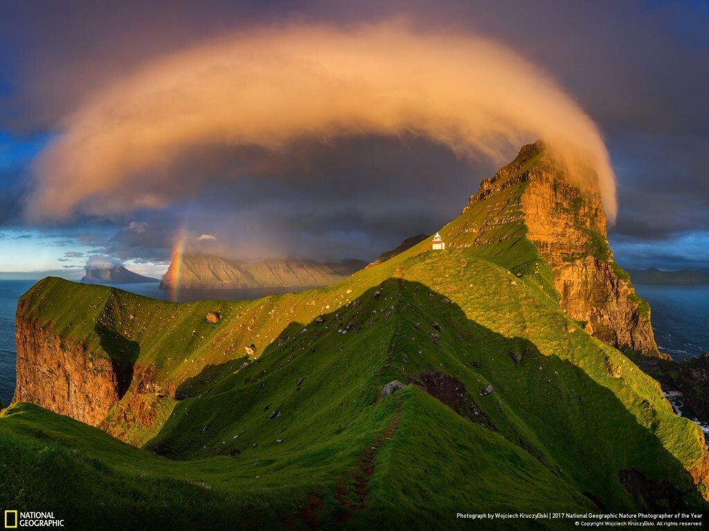 KALSOY PHOTO AND CAPTION BY WOJCIECH KRUCZYŃSKI Sunset illuminates a lighthouse and rainbow in the Faroe Islands.