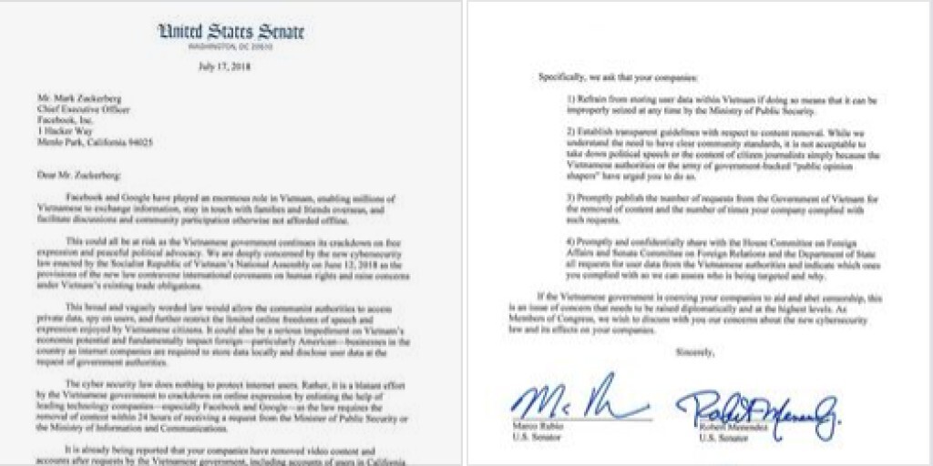 Toàn bộ VĂN THƯ NGHỊ SĨ QUỐC HỘI (THƯỢNG VIỆN) MỸ GỬI FACEBOOK!
