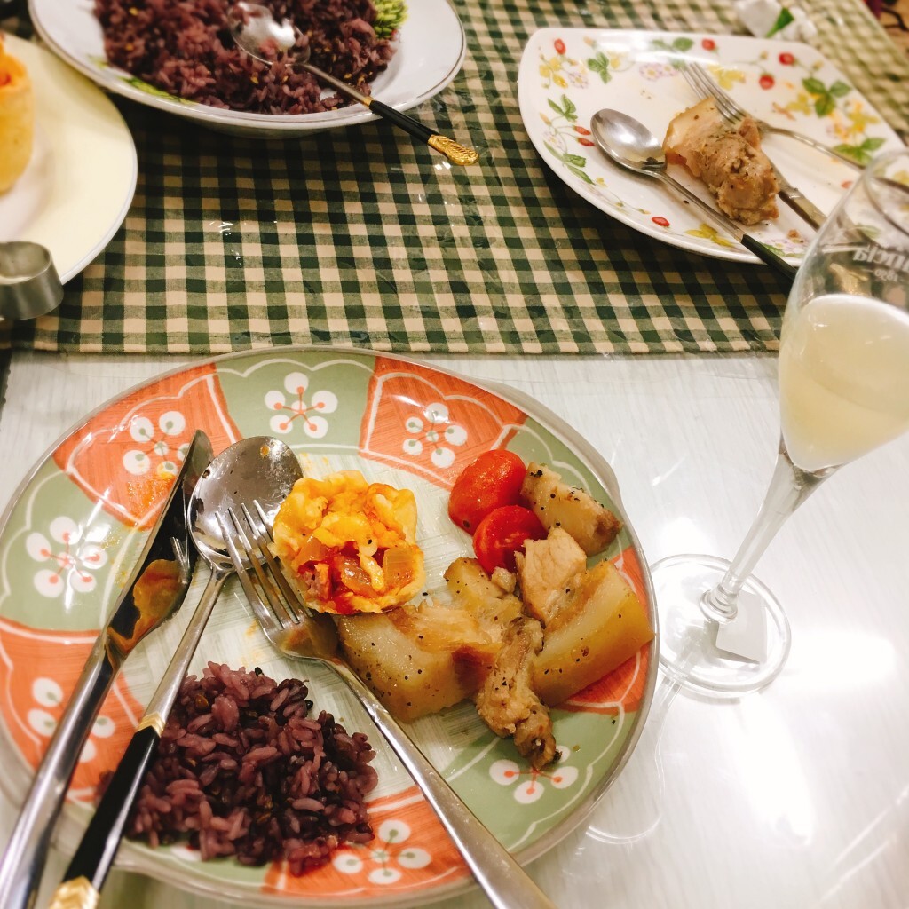 Seasoned pork, pizza pocket and steamed rIce wIth lentils