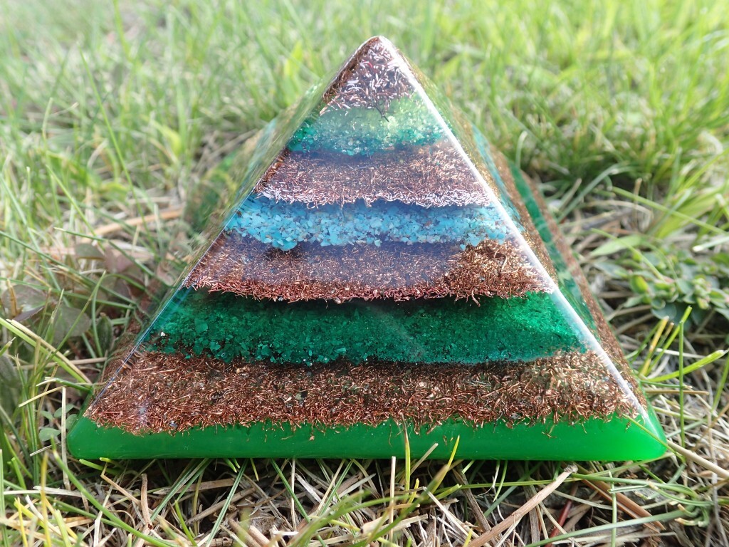 One of our most recent Orgone Pyramid THIS IS A BEAUTIFUL HAND MADE ORGONE PYRAMID THAT CONTAINS THE FOLLOWING STONES AND METAL: COPPER, QUARTZ, MALACHITE, AND TURQUOISE : GREEN TINT
