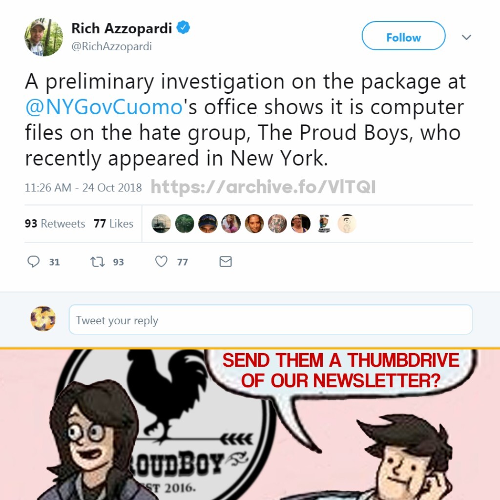 "A preliminary investigation on the package at @ NYGovCuomo's office shows it is computer files on the hate group, The Proud Boys, who recently appeared in New York."