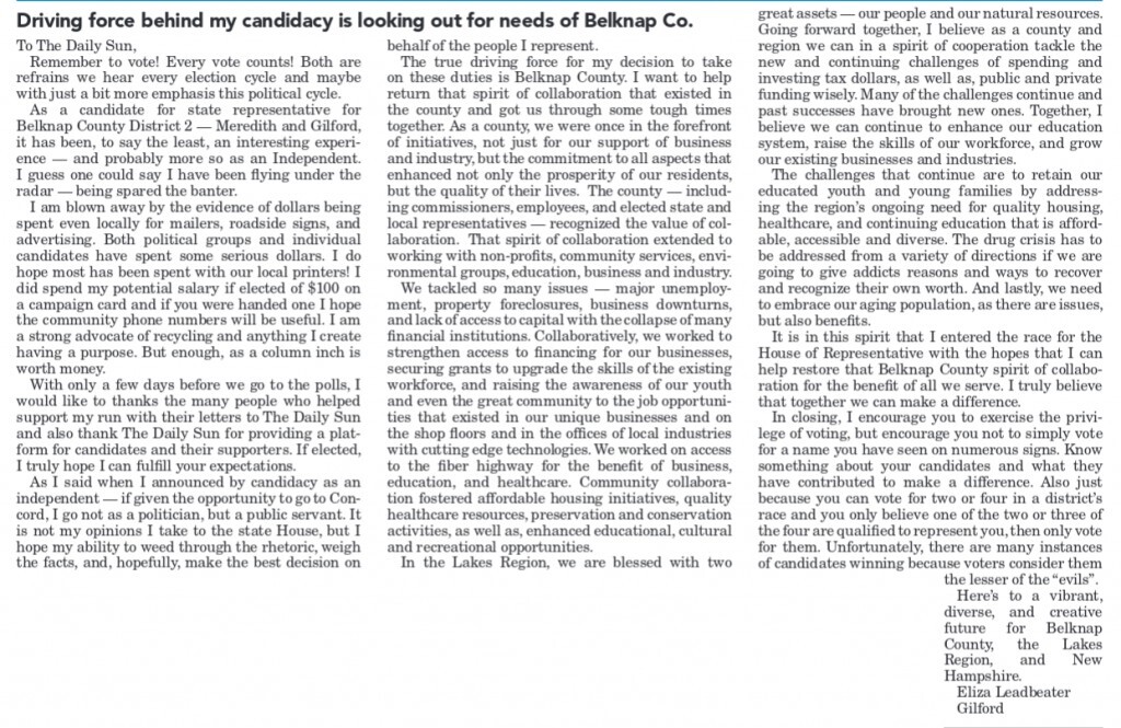 Gilford/Meredith is a fairly solid republican district; in the last three terms one Dem has held one of the four seats but only for one...See more