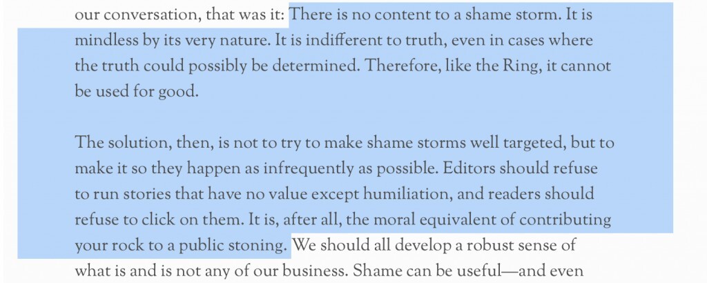 In keeping with the theme of the week, and indeed of the era, here's a thoughtful essay on internet shaming, mob behavior, and (somewhat unexpectedly) redemptive suffering and humility.