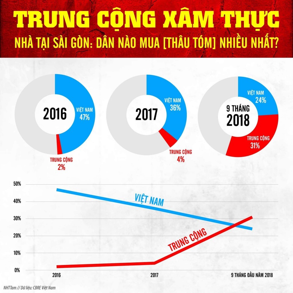 Chỉ mới cách đây 2 năm, vào năm 2016 số lượng nhà cửa tại Sài Gòn được/bị mua bởi người Trung Cộng chỉ chiếm 2%. Đến năm 2017, con số tăng gấp đôi lên 4%.