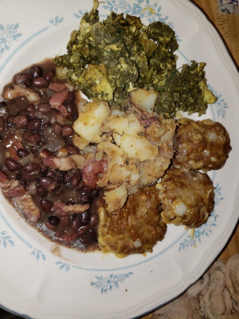 ...with onions & grass fed, freshly slaughtered pork bacon; cajun red potatoes; skillet Spinach quick quiche with onions; mini grass fed beef 4 cheese burgers.