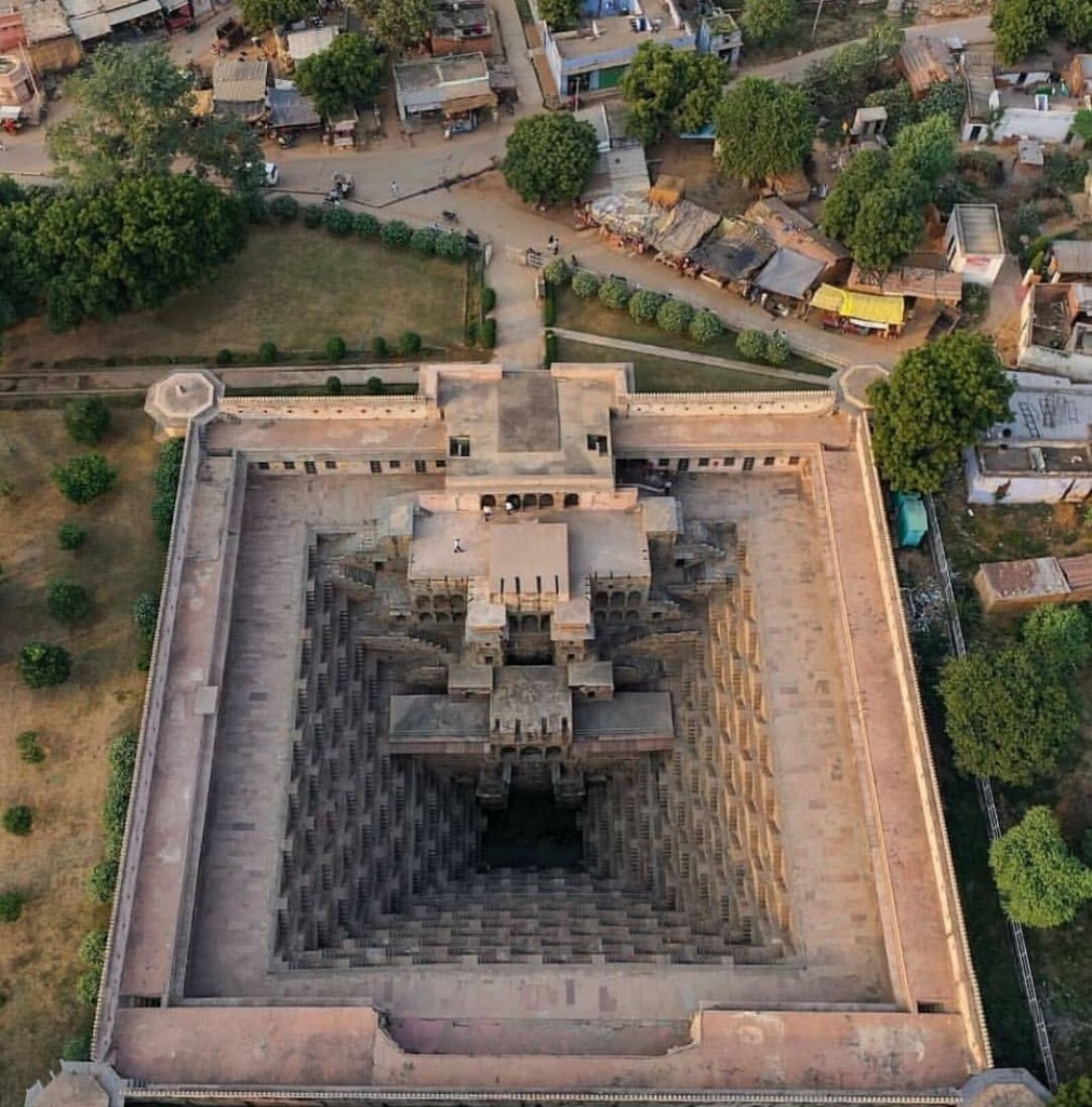An aerial view of Chand Baori. It extends approximately 30 m (100 ft) into the ground making it one of the deepest and largest stepwells in India.