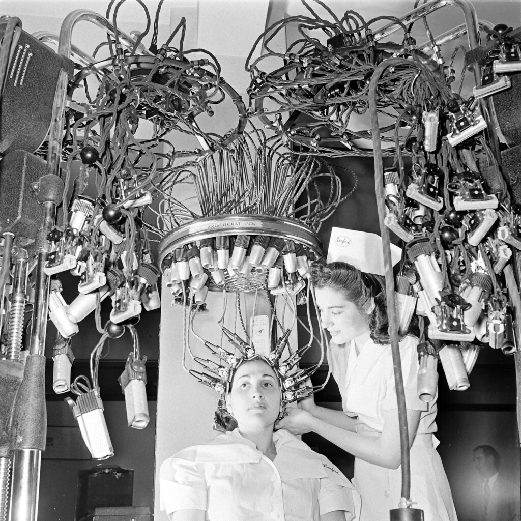 A Woman with Her Hair in Permanent Wave Curlers at a Beauty School, 1940 #history