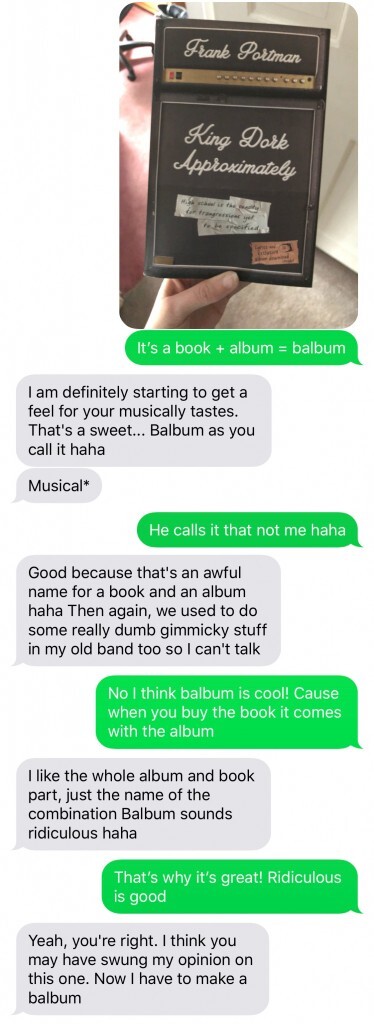 BALBUM!!! This came up on the photos app on my phone as a "memory" from one year ago. Me defending @frankportman's use of the word "balbum".* When you buy his book, King Dork Approximately, you get a free album. When you buy his band's album, King Dork Approximately The Album, you get a free book. When you buy them both, you get it all half off! So what are you waiting for?! Go buy it! I can guarantee it'll be the best balbum you've ever bought! And it's only ten bucks! There are many places you can purchase from, but I strongly suggest buying through Sounds Rad. You'll be supporting an awesome record label, and you'll get your copy signed for free: https://www.soundsradical.com/store/p30/King_Dork_Approximately_Signed_Paperback_Edition.html And if you *really* can't afford the balbum, the least you can do is stream the album for free on YouTube and wonder how you got so lucky as to hear something so amazing for free: https://www.youtube.com/watch?v=bBIWe6arK4E&list=PLipc_noL4xpLS4GGovAx6-ms1pW2gyWq_ * Looking back, I can see the confusion when I said "he calls it that not me" -- I just meant I wasn't the one who made it up. I of course always have and always will support the use of the word "balbum". Balbum forever! #mtxforever #balbum #books #music #minds