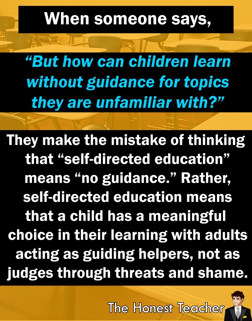 I constantly brush up against this misapprehension. Self-directed education DOES NOT MEAN that young people are set loose without any sort of help, guidance, or direction. It simply means that children have a meaningful choice in their learning and that adults act as helpers, not...See more