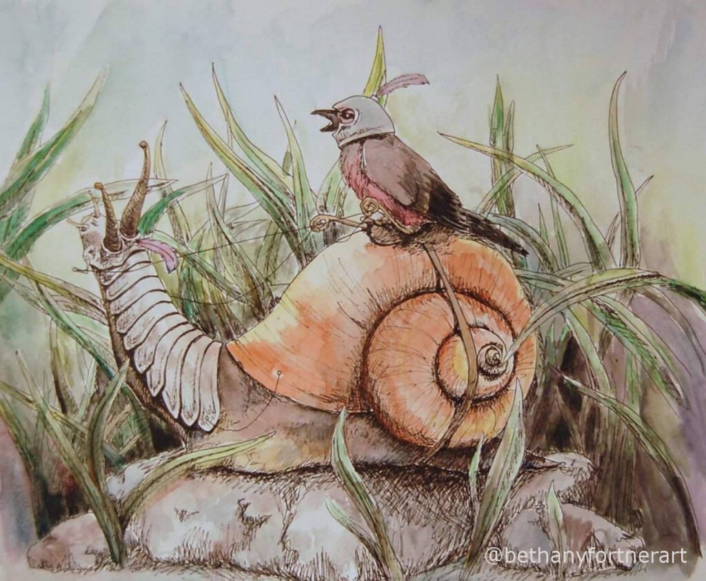 ... riding his trusty snail steed! Makes perfect sense... #art #watercolor #watercolorillustration #animalart #illustration.