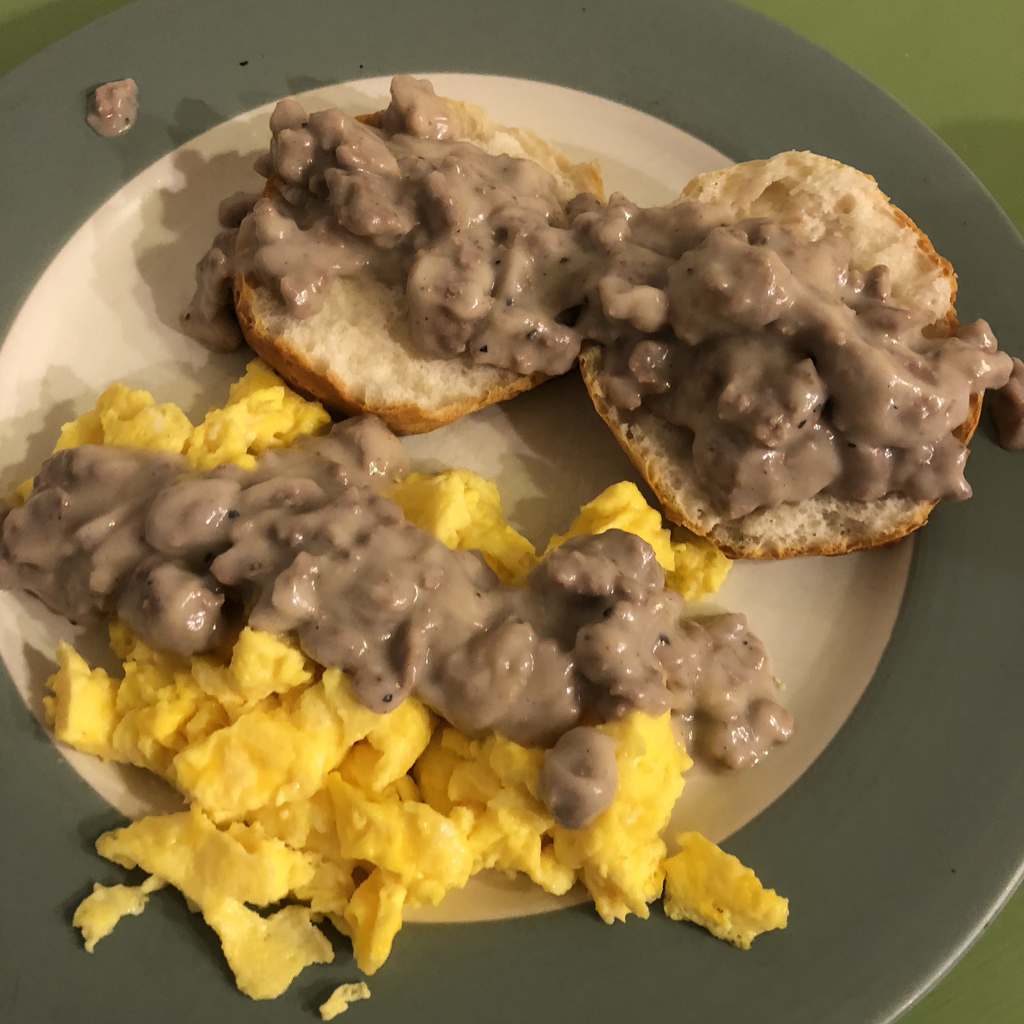 Prefect raining day breakfast! Venison sausage gravy over biscuits and eggs. #venison #homecooking #venisonsausage
