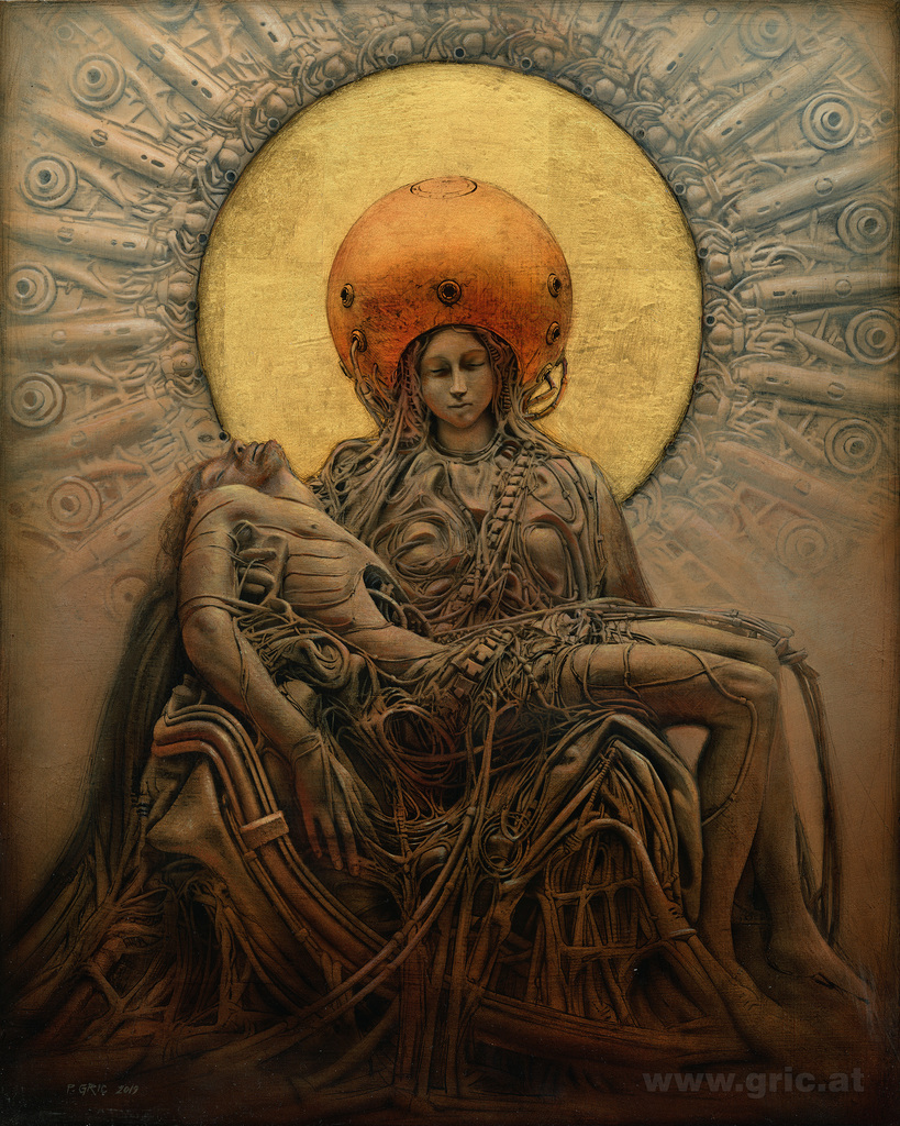 "Android-Pietà IV", 2019 Acrylic & 24 carat gold leaf on fiberboard 40 x 32 cm / 15.75 x 12.6 in The process can be seen here: http://gric.at/gallery/bild355_m.htm Giclée prints: http://gric.at/shop/prints.htm Books: http://www.blurb.com/user/petergric Posters: https://www.posterlounge.co.uk/artists/peter-gric/ Various items: https://society6.com/gric Peter Gric's Newsletter: http://gric.at/newsletter #art #painting #surrealart #gric