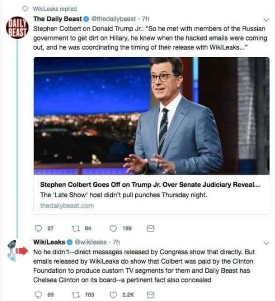 It's an information war. The opposition uses propaganda to spew and spin their lies so that the average person can't see truth. Our job as information warriors is to educate and enlighten others whenever opportunities present themselves. This is what Wikileaks did to The Daily Beast and Stephen Colbert below.
