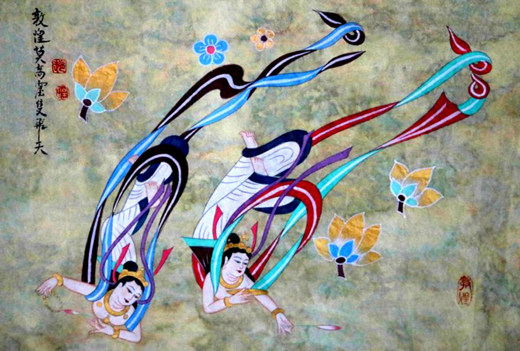 Two flying fairies from a musical world in a celestial realm - a copy of a Mogao cave mural https://www.viewofchina.com/mogao-grottoes/