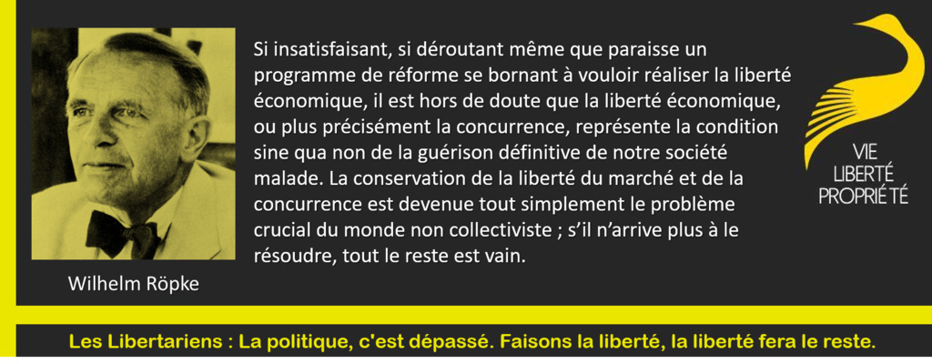 "Si insatisfaisant, si déroutant même que paraisse un programme de réforme se bornant à vouloir réaliser la liberté économique, il est hors de doute que la liberté économique, ou plus précisément la concurrence, représente la condition sine qua non de la guérison définitive de notre société malade. La conservation de la liberté du marché et de la concurrence est devenue tout simplement le problème crucial du monde non collectiviste; s’il n’arrive plus à le résoudre, tout le reste est vain." -- Wilhelm Röpke