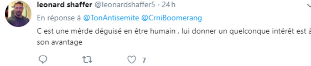 Les goyim sont des bêtes déguisées en êtres humains, il a bien appris son Talmud et ce que le rav Dynovisz lui ont enseigné : https://www.youtube.com/watch?v=-FrtlRFIwpU De la haine raciale autorisée.