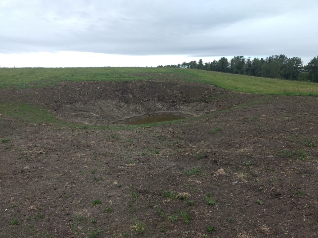 Here is our homestead pond/dugout a couple months after it was dug last summer. We were lucky that we have relatives that know how to operate heavy machinery so we only had to rent the excavator. It will be about 12 feet deep when full and is about 60 x 40' wide. In this picture it probably has about 3 feet of water in the bottom already.